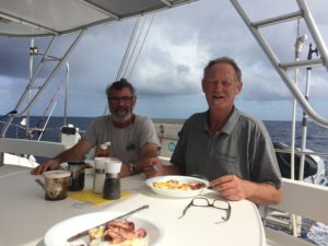 We embarked on our passage-making for this year with some trepidation after the torrid passage down from Fiji to New Zealand last year. Good friend Jim Hutchinson was to be our crew this time round and we were very pleased indeed to have him aboard. The first two days’ sailing were delightful; a good introduction to catamarans for Jim. The new sails and clean hulls certainly made a difference. Then the wind and swell picked up and up and up and went forward, and further forward, and further forward. Plans to progress straight to Tonga quickly became a plan to head to Minerva Reef which quickly became a plan to turn around and head back to Raoul Island to sit out the fierce northerly and take care of the air lock in the port motor cooling system. Two days there confirmed the reports we’d heard that it’s a place to visit… if you’re desperate. As soon as the wind turned west we were off again, this time with a (mostly) pleasant passage the rest of the way to Tonga.